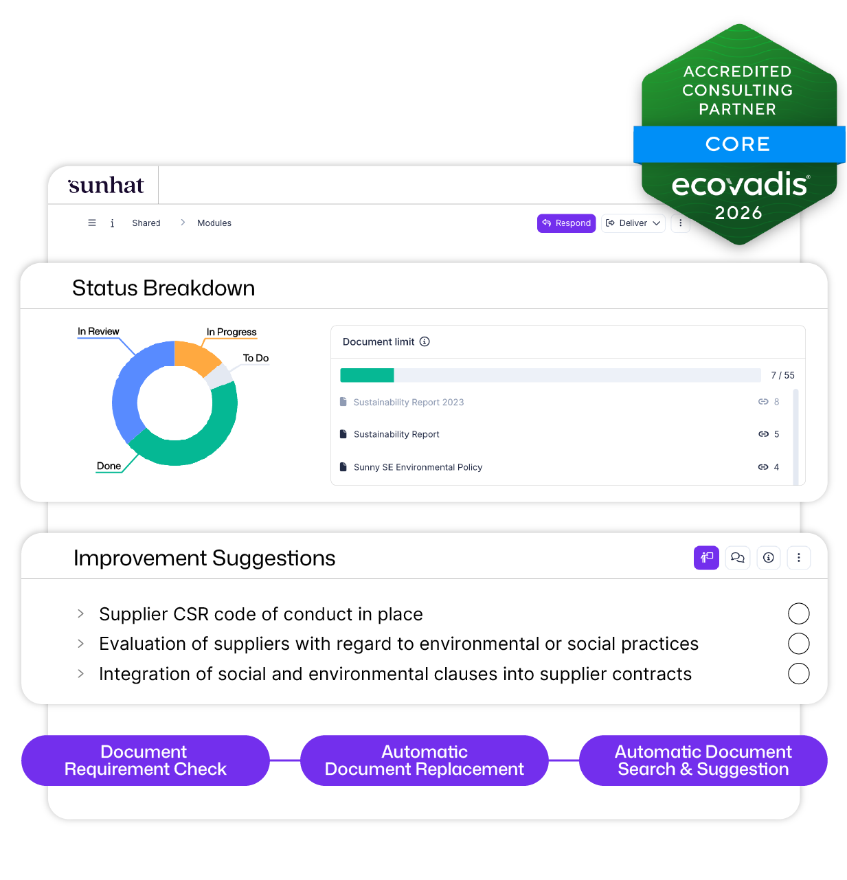 One-click distribution of documents (like a new Sustainability Report) across all relevant questions, plus instant reuse from other frameworks.